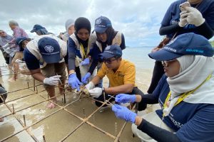 Suasana pemasangan bibit terumbu karang pada meja besi yang nantinya akan ditanam di area konservasi di Kabupaten Pesisir Selatan, Sumatera Barat pada Jumat