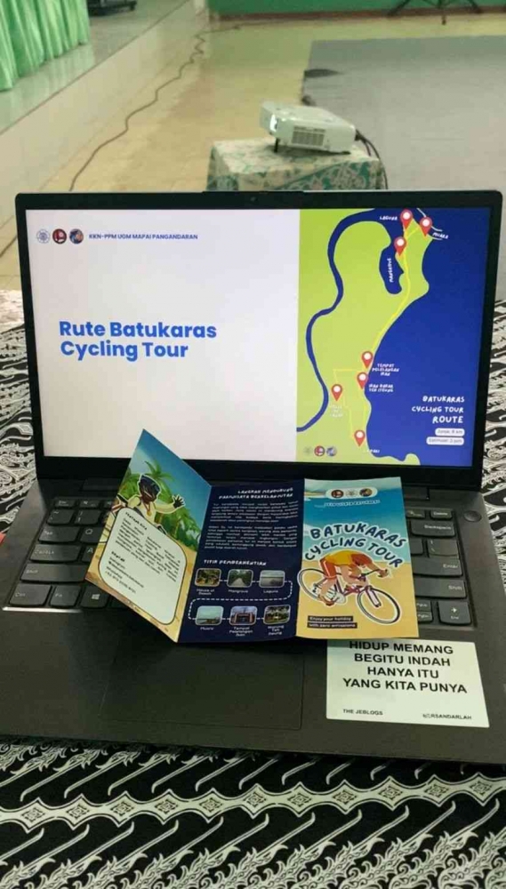 Materi presentasi dan brosur wisata tur bersepeda Desa Batukaras. Foto: KKN PPM Unit 2025-JB016 Cijulang