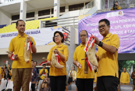 Sebanyak 1044 mahasiswa didampingi oleh Dosen Pembimbing Lapangan (DPL) menghadiri upacara penerjunan Kuliah Kerja Nyata – Pembelajaran Pemberdayaan Masyarakat Universitas Gadjah Mada (KKN-PPM) UGM Periode 4 Tahun 2025 di Gedung Olahraga (GOR) Nusantara UGM, Jumat (19/12). Peserta KKN-PPM periode ini berasal dari 18 Fakultas dan Sekolah Vokasi. Pada periode ini terdapat 40 unit dengan lokasi pengabdian yang tersebar di 10 Provinsi (6 Pulau Jawa, 4 Pulau Jawa), 24 Kabupaten/Kota, 39 Kecamatan, serta 80 Desa/Kelurahan. Operasional KKN-PPM Periode 4 ini akan dilaksanakan selama 50 hari dimulai pada tanggal 20 Desember 2025 sampai dengan 7 Februari 2025.